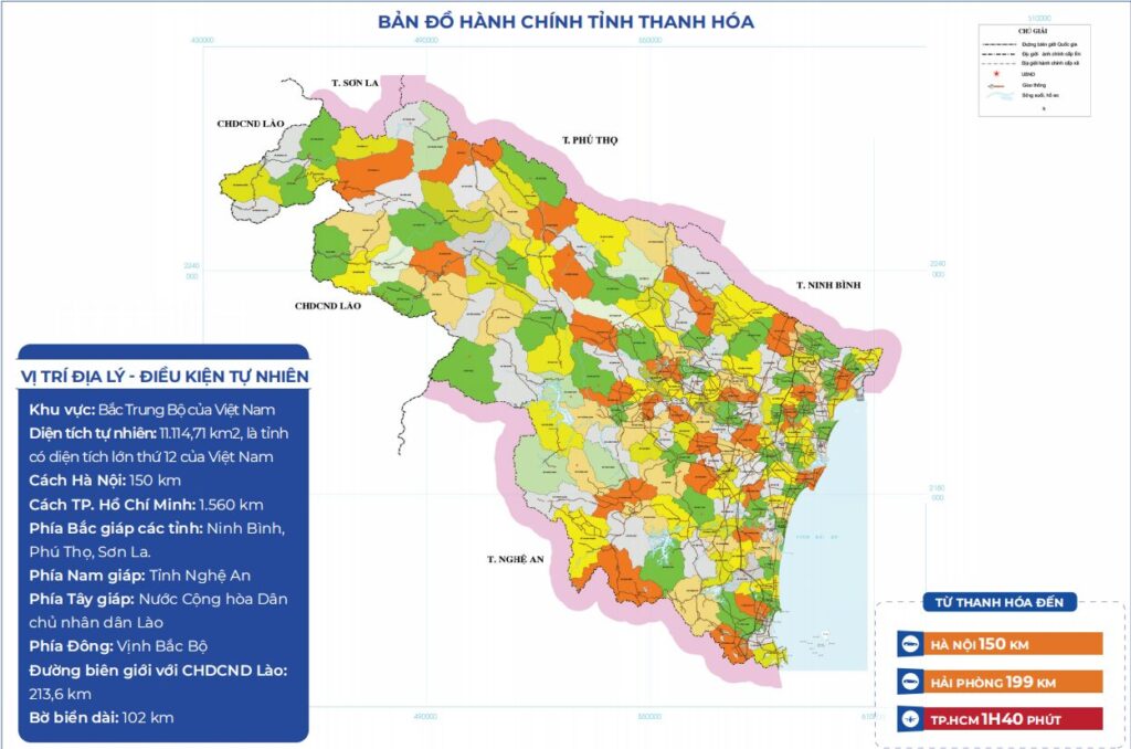 Thanh Hóa có diện tích tự nhiên 11.114,71 km2, được chia thành 166 đơn vị hành chính, gồm: 19 phường và 147 xã. Với dân số hơn 4,3 triệu người; lực lượng lao động gần 2,7 triệu người trong thời kỳ dân số vàng, trình độ văn hóa, chuyên môn tương đối cao phù hợp với nhiều lĩnh vực: công nghệ, khoa học kỹ thuật, sản xuất kinh doanh.