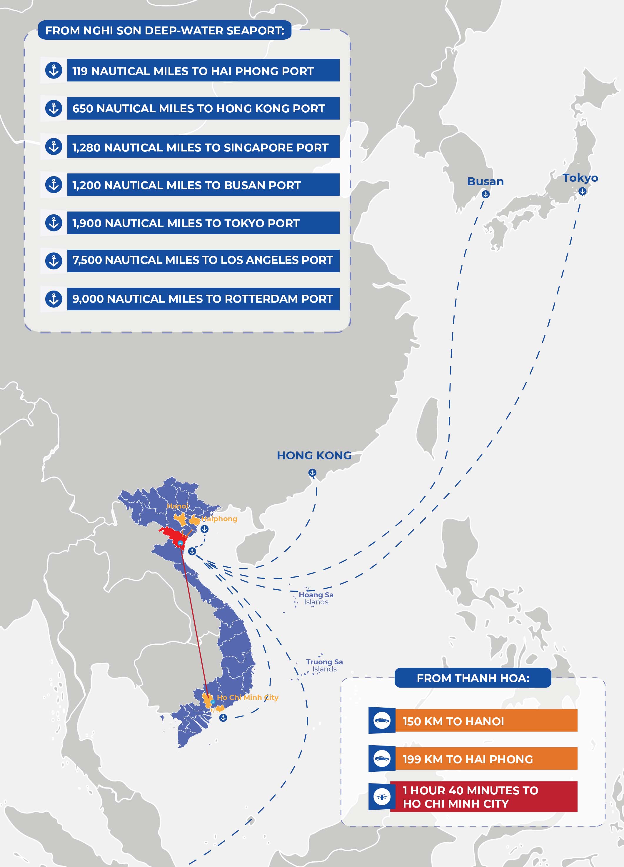 Nghi Son deep-sea port is a type-I national general port and has the potential to develop into a notable seaport. Currently, it has 35 operating piers, buoys, and anchoring areas totaling 5,343m. It received the most significant ship with a tonnage of 320,000 tons and can receive 100,000 DWT ships. The goods that passed through the port in 2023 reached 46.1 million tons (45.8 million tons passed through Nghi Son port). There are 02 shipping lines (CMA - CGM shipping lines and VIMC shipping company) operating international container transport routes from Nghi Son to Europe, the US, and Singapore.
