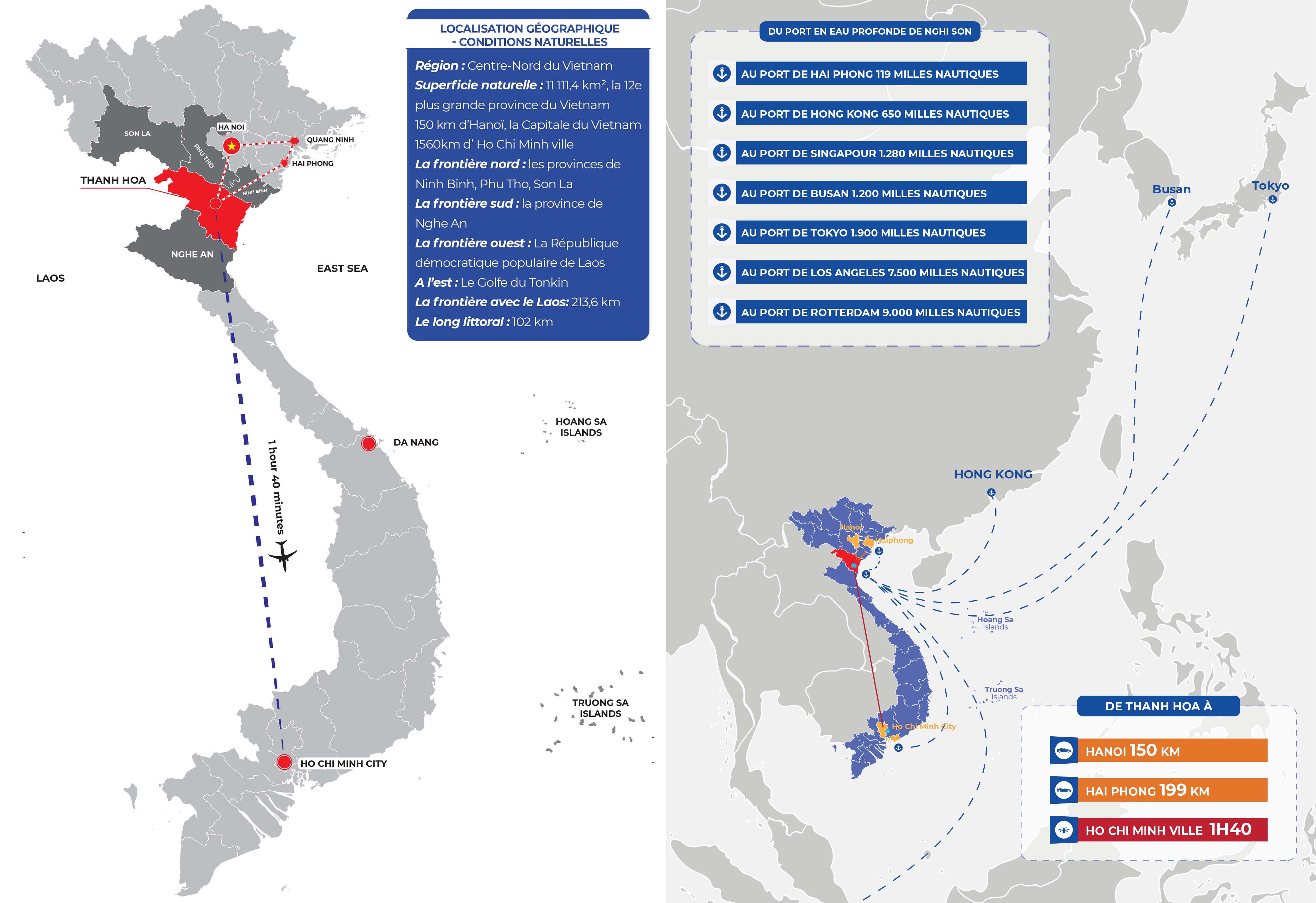 La province de Thanh Hoa est située dans la région Nord-Centre du Vietnam, à 150 km de Hanoï et à 1 560 km de Ho Chi Minh-Ville (1 heure 40 minutes par avion) ; à l'ouest, la province est limitrophe de la République Démocratique Populaire du Laos, avec une frontière longue de 213,6 km ; à l'est se trouve la baie du Golfe du Nord avec une longueur de Côte de 102 km ; au nord, elle est bordée dans les provinces de Ninh Binh, Phu Tho et Son La ; au sud, elle est limitrophe de la province de Nghe An. Elle est proche de la région économique clé du Nord.