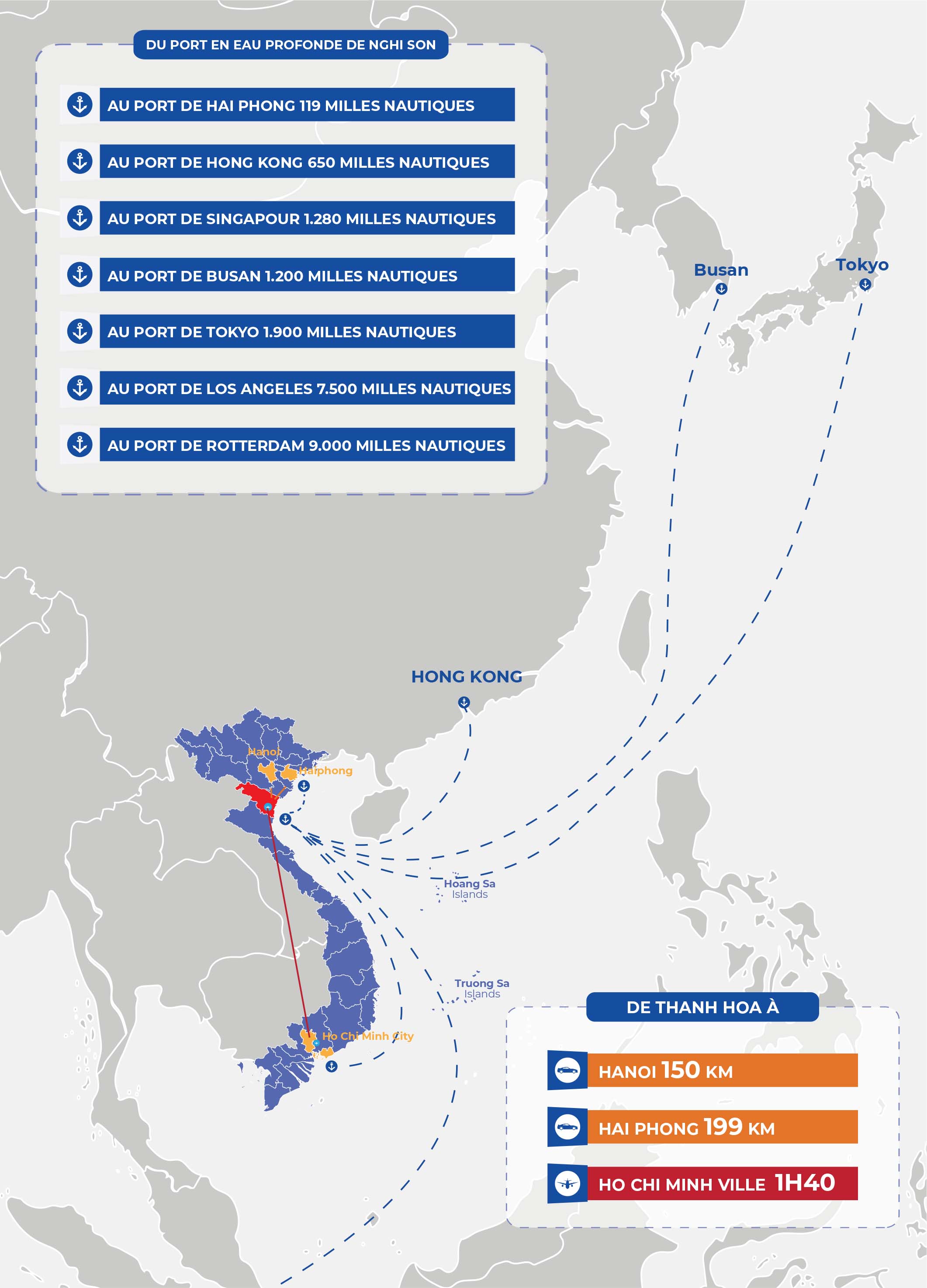 Le port maritime de Nghi Sơn est un port polyvalent national, un point focal régional de type I qui sera potentiellement planifié pour devenir un port maritime spécial; des quais et des ports dans la région de Le Mon. Actuellement, 35 quais, quais flottants et zones de mouillage pour le transbordement sont en exploitation avec une longueur totale de 5.343 m.Les quais ont accueilli des navires d'un tonnage de 320.000 tonnes et sont capables de recevoir des navires jusqu'à 100.000 TP ; le volume de marchandises transitant par le port a atteint 46,1 millions de tonnes en 2023 (dont 45,8 millions de tonnes via le port de Nghi Son). Actuellement, deux compagnies maritimes (CMA - CGM et la Compagnie de Transport Maritime VIMC) sont en activité et exploitent des itinéraires internationaux de transport de conteneurs de Nghi Son vers l'Europe, les États-Unis, le Singapour, etc.