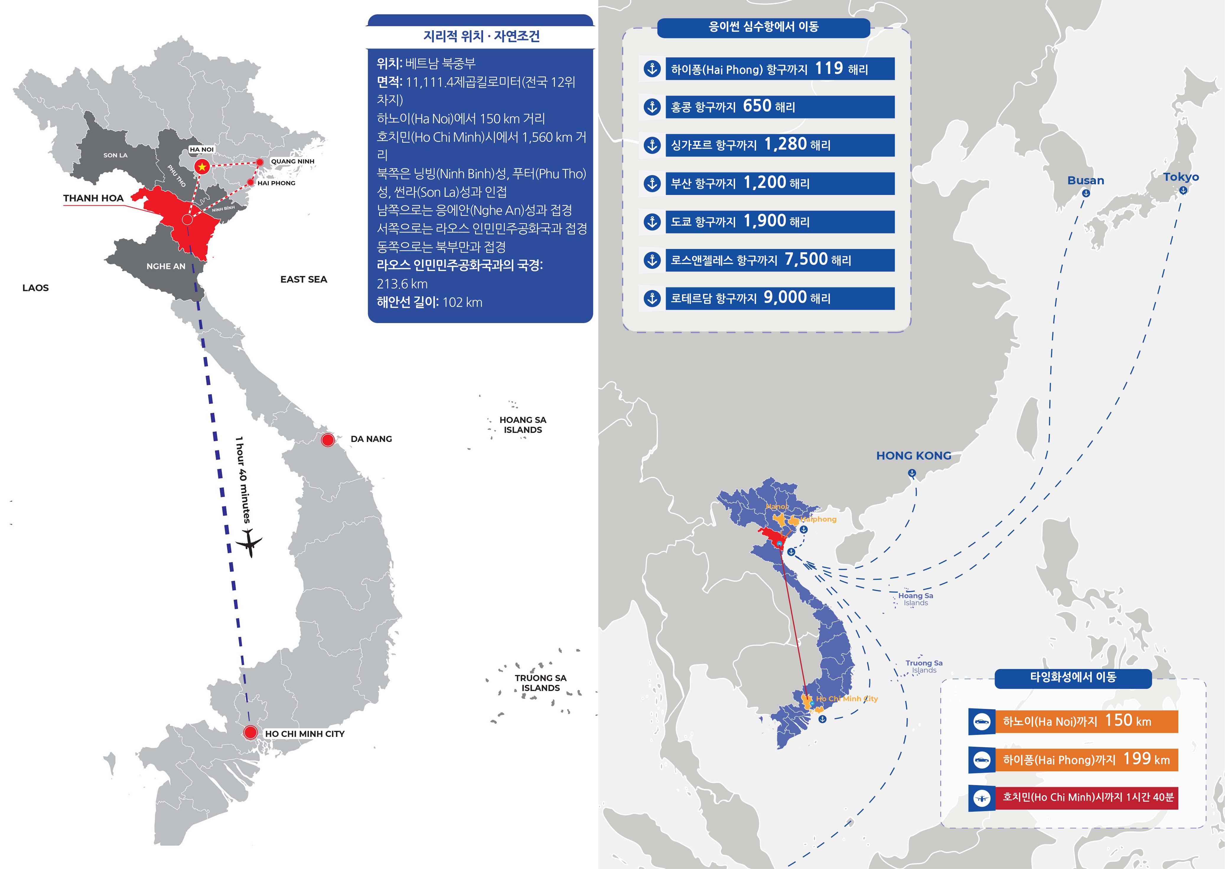 탄호아성은 베트남 북중부 지역에 위치하며 하노이에서 150km, 호치민시에서 1,560km(비행기로 1시간 40분 소요) 떨어져 있습니다. 서쪽으로는 라오스 인민민주공화국과 213.6km의 국경을 접하고 있으며, 동쪽으로는 통킹만과 102km의 해안선을 접하고 있습니다. 북쪽으로는 닌빈성, 푸토성, 썬라성, 남쪽으로는 응에안성과 접하고 있습니다. 북부의 주요 경제 지역과 인접해 있습니다.