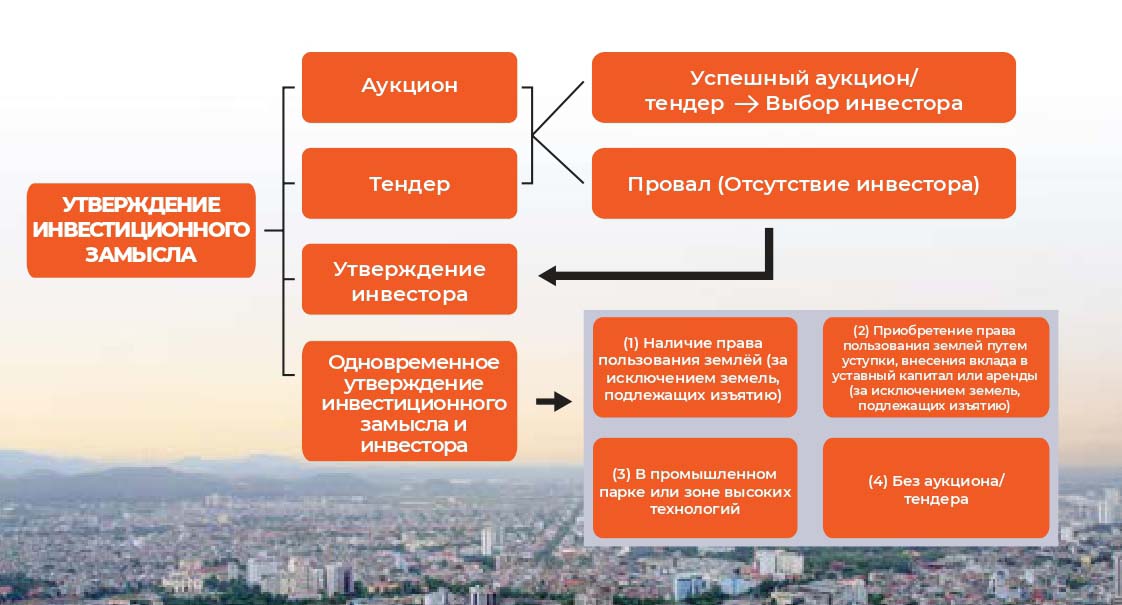 Инвестор подаёт документы на изменение целевого назначения земель в Департамент природных ресурсов и охраны окружающей среды для экспертизы; получает утверждение изменения целевого назначения земель от Народного совета провинции; подаёт документы на аренду земли в Департамент природных ресурсов и охраны окружающей среды для экспертизы; получает утверждение от Народного комитета провинции на изъятие, предоставление и аренду земли для реализации проекта